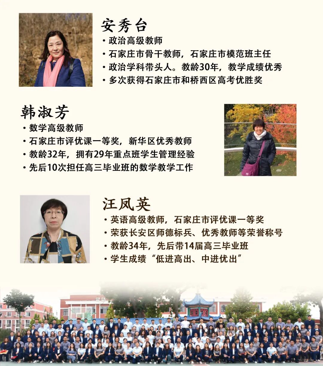 学校坚持“专家引领+骨干执教”的模式,组建了由省市骨干、优秀教师组成的名师团队。他们踏实肯干,功底扎实,经验丰富,成绩突出,学生喜爱,真正实现了“持续提高、不断突破、勇攀高峰”的目标,帮助每一位学生提高成绩,升入理想学府。