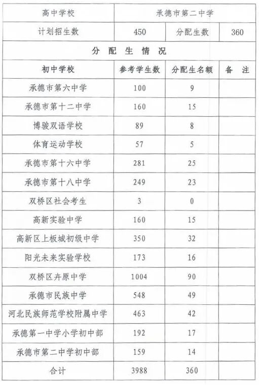 2023年承德市第二中学分配生计划表