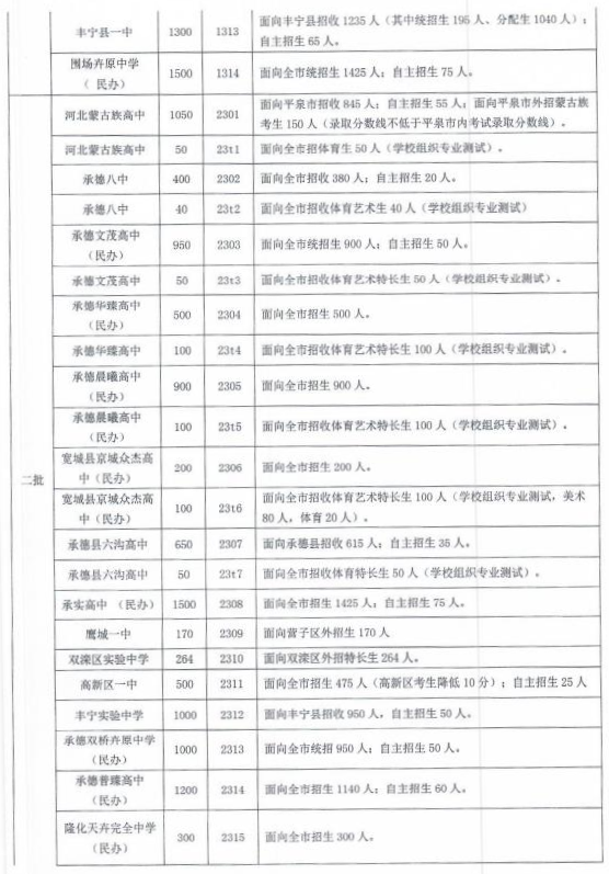 第二批普通高中招生:承德承实高中 (民办)、河北蒙中承德八中、高新区一中、双滦实验中学(面向全市招特长生)、鹰城一中(面向营子区外招生)、承德县六沟高中、丰宁实验中学、承德文茂高级中学(民办)、承德双桥卉原中学 (民办)承德华臻高级中学(民办)、承德晨曦高级中学 (民办)、宽城县京城众杰高级中学(民办)、滦平县普臻高级中学(民办)、隆化天卉完全中学(民办)、承德市圣泉高级中学(民办)。职普融通招生学校: 双滦实验中学、隆化县第一中学、兴隆县第一中学、宽城县第一中学。