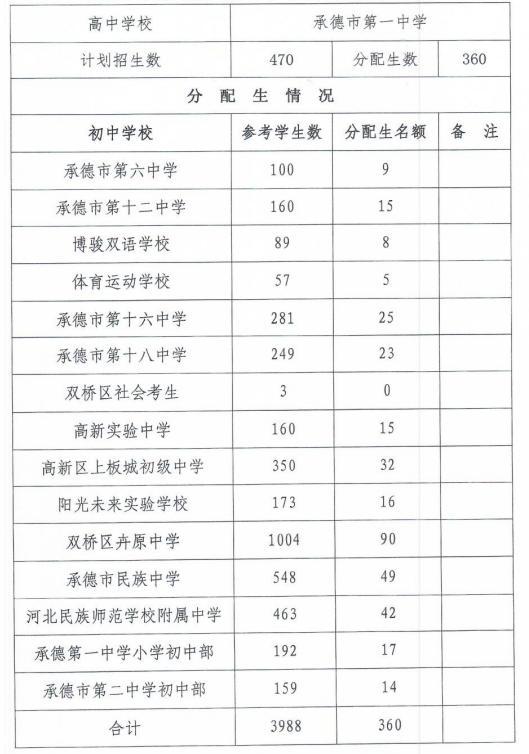 2023年承德市第一中学分配生计划表