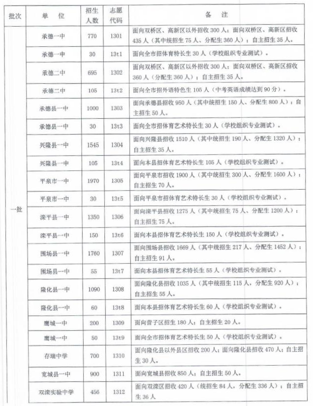 第一批:承德一中、承德二中、存瑞中学、承德县一中、宽城县一中、兴隆县一中、平泉市一中、滦平县一中、丰宁县一中围场县一中、隆化县一中、双滦实验中学 (招双滦区考生)、围场卉原中学(民办)、鹰城一中(招营子区考生)。