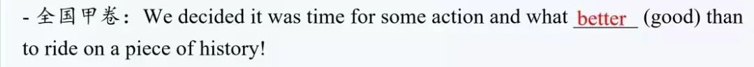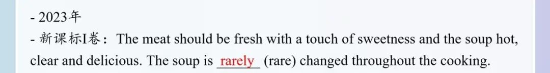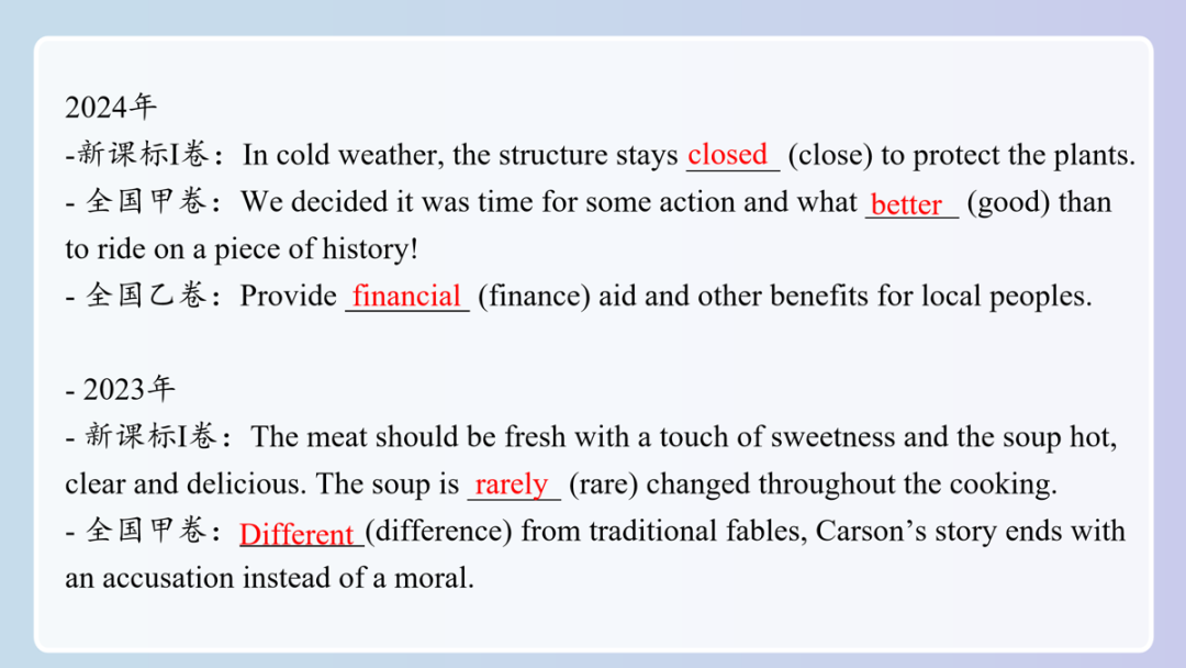 在stay后需用形容词作表语,描述主语 “the structure”的状态。“close” 作形容词时侧重 “距离近的、亲密的”,而 “closed” 表示 “关闭的、闭合的”。整句翻译:在寒冷天气里,该结构会保持闭合状态,以保护植物。2. 此处考查形容词比较级的用法。有标志词 “than”,表示 “比…… 更……”,因此需用 “good” 的比较级形式 “better”。整句翻译:我们认为是时候采取些行动了,还有什么比踏上一段历史(的旅程)更棒的呢!3. 此题需用形容词修饰名词 “aid”,构成 “financial aid” 这一常用搭配,意为 “经济援助”。“finance” 是名词(金融、财政)或动词(提供资金),其形容词形式 “financial”(财政的、金融的)。4. 此处需用副词修饰动词 “changed”,表示动作发生的频率。“rare” 是形容词,意为 “稀有的、罕见的”,其副词形式 “rarely” 表示 “很少、不常”。整句翻译:肉质应新鲜且略带甜味,汤汁则要滚烫、清澈、美味。在整个烹饪过程中,这道汤的做法很少会有改动。