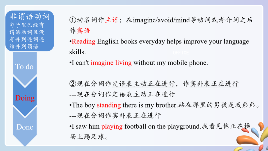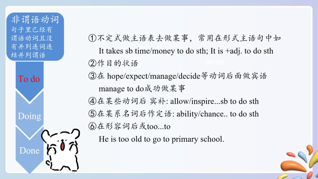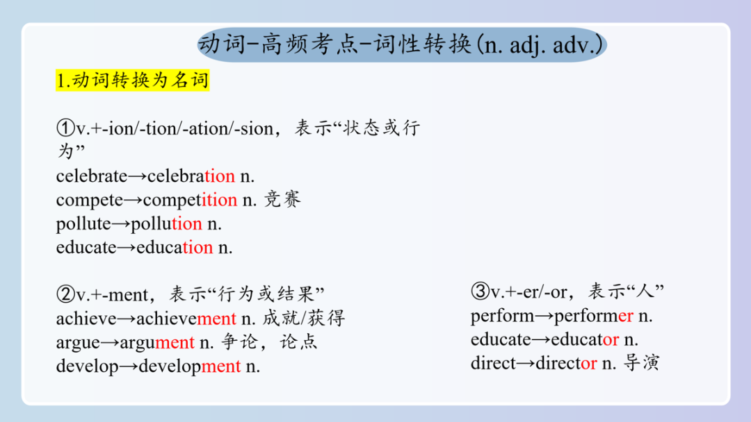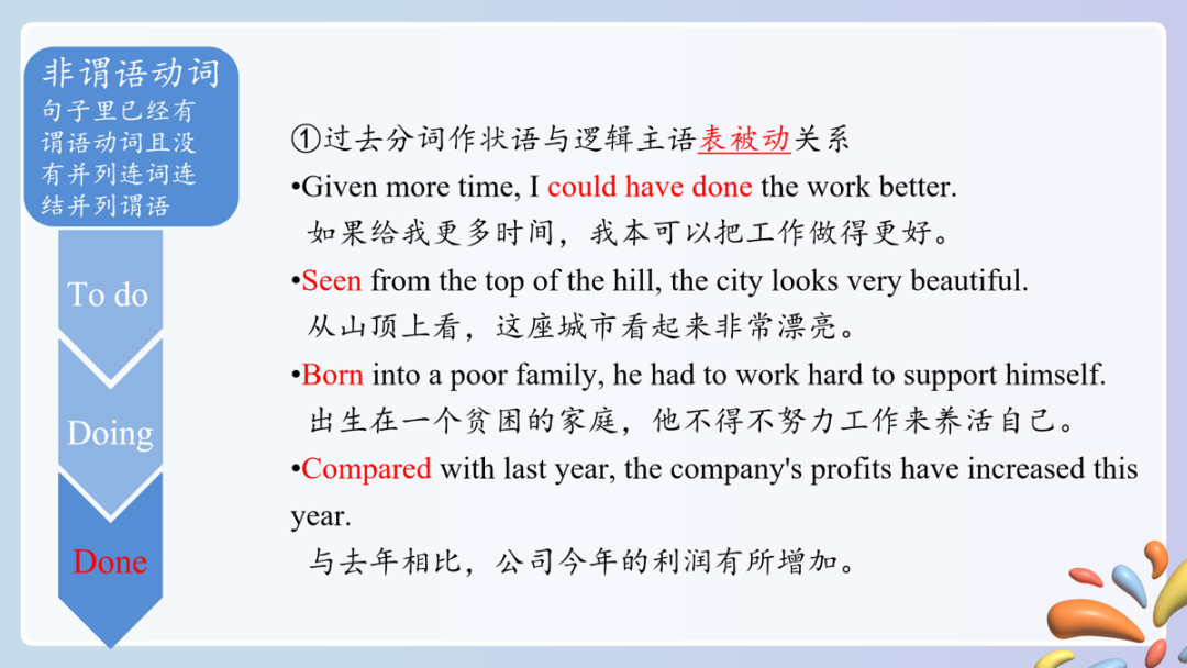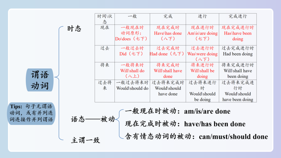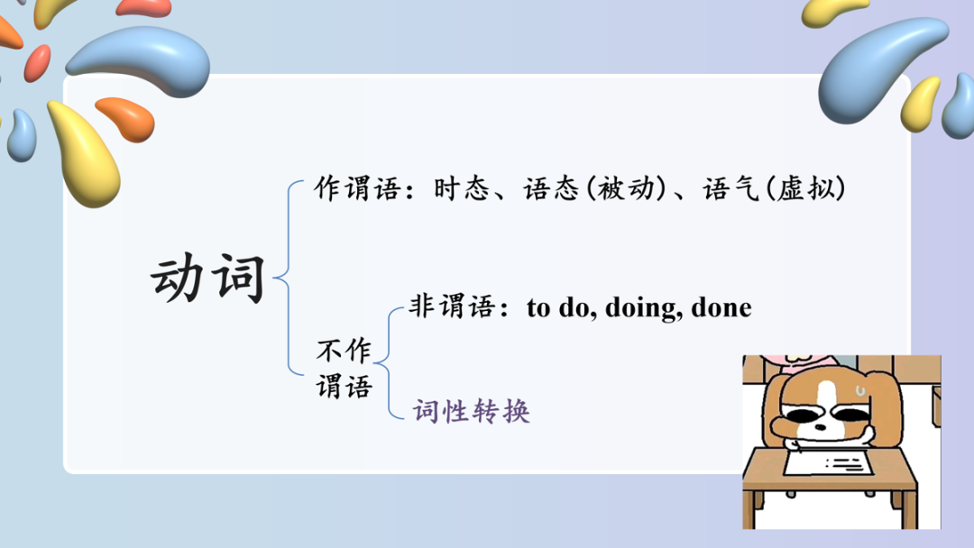 以上三页PPT展示了当所给动词作谓语时需要注意到的点,包括时态、语态、主谓一致。而从非谓语角度出发,则需要考虑到对句子的结构分析和理解,根据合适的情况在 to do, doing和done中做出选择。除此之外,还有关于词性转换的板块,可以在平时的学习生活中多积累。