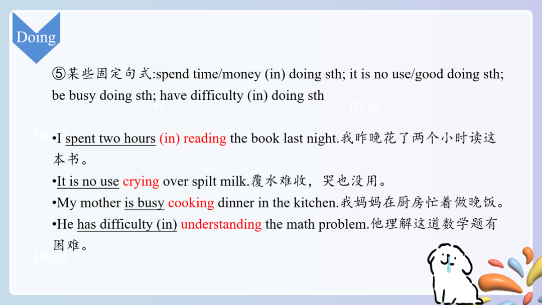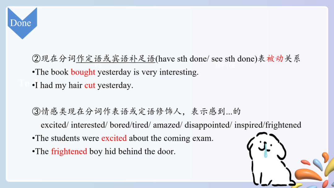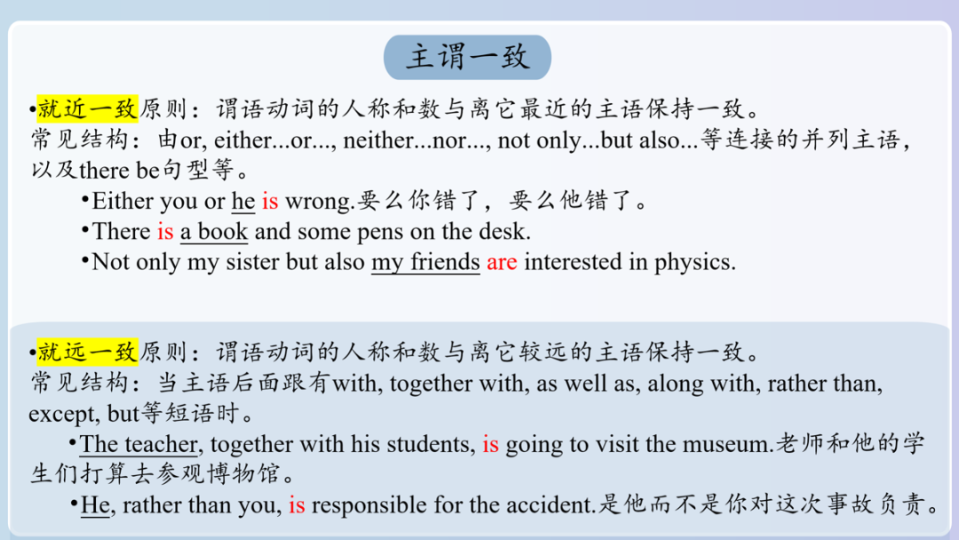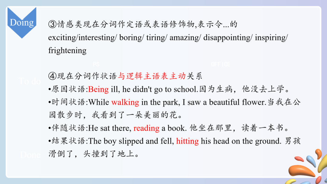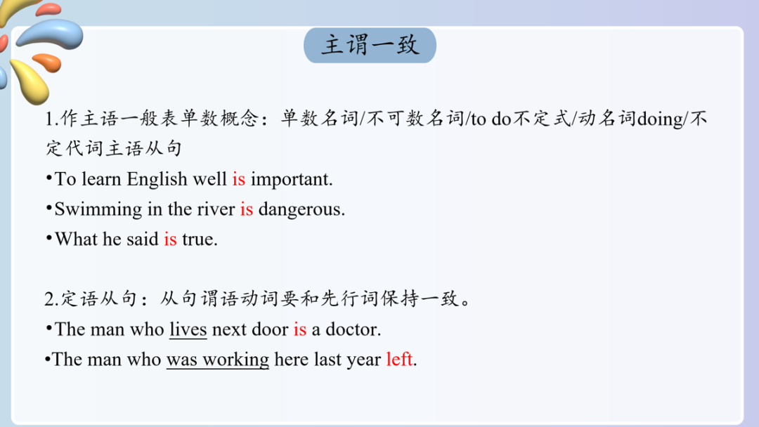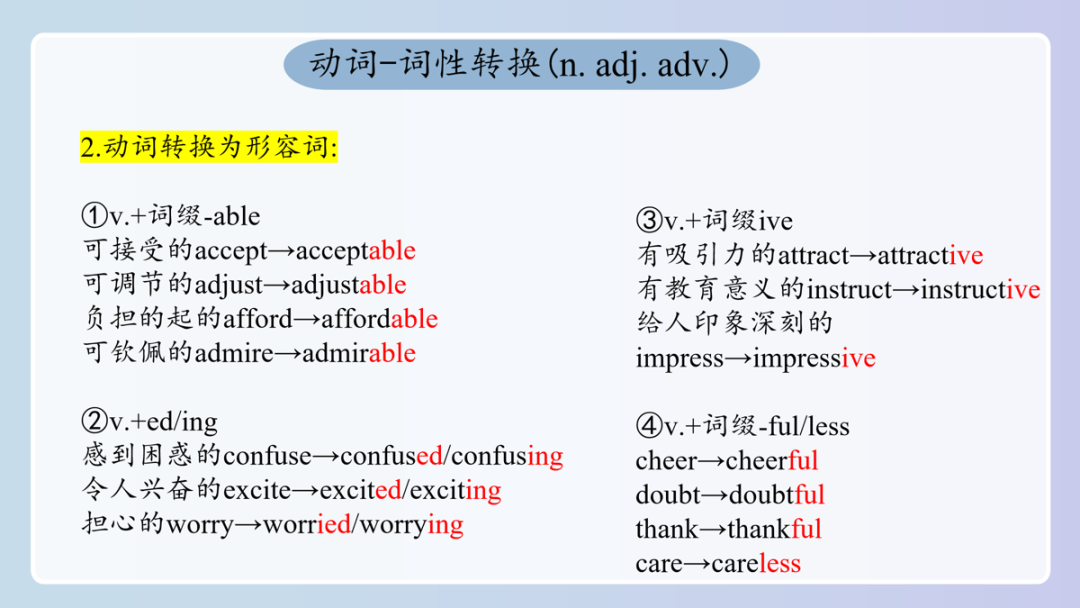 以上三页PPT展示了当所给动词作谓语时需要注意到的点,包括时态、语态、主谓一致。而从非谓语角度出发,则需要考虑到对句子的结构分析和理解,根据合适的情况在 to do, doing和done中做出选择。除此之外,还有关于词性转换的板块,可以在平时的学习生活中多积累。