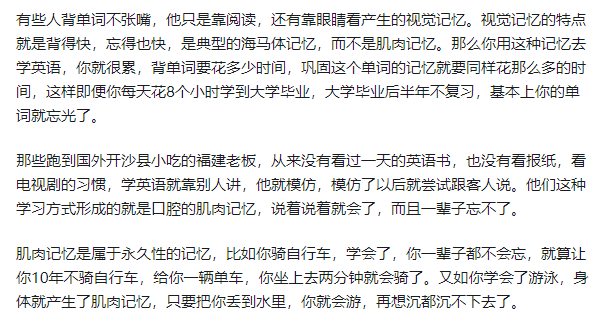 背单词如果停留在大脑层面,那就肯定还是会遗忘,因为在海马体产生的记忆,它就类似于电脑内存,管你的内存大不大,擦写速度快不快,它都很容易被擦除。只有当英语的单词记忆变成你身体一部分的肌肉记忆以后,尤其是口腔的肌肉记忆,它才可以像写入蓝光光盘那样永不忘记。
