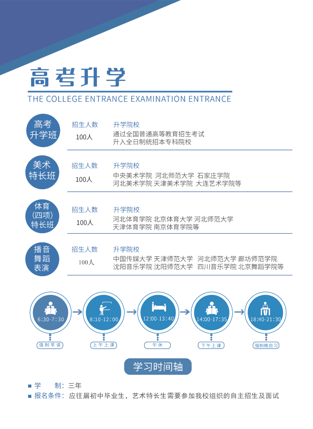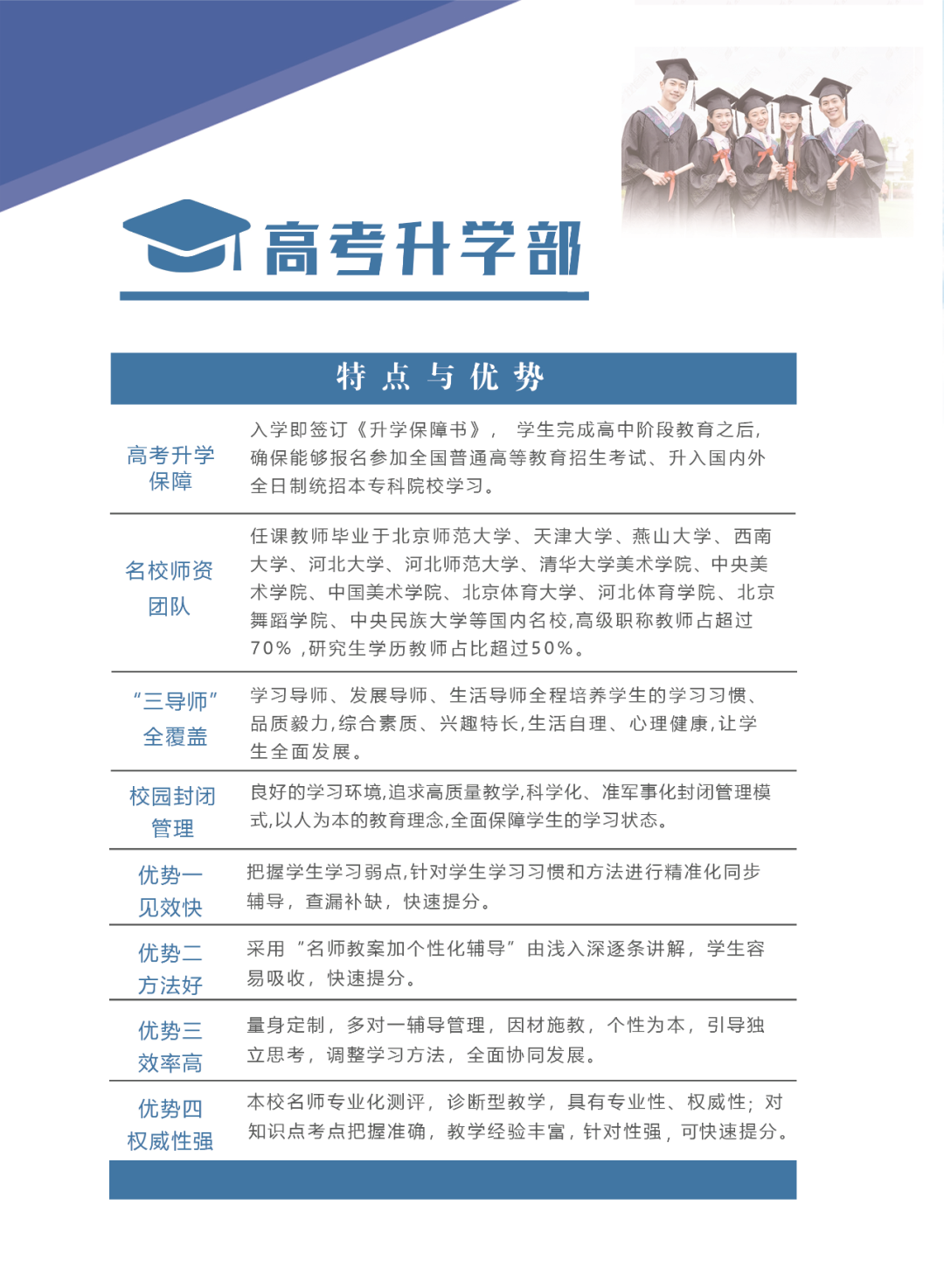 3、升学始终坚持以提升教育教学质量为中心,以构建高效课堂为重点,培养学生具备较高的文化水平及较好职业道德,以优异的成绩升入自己理想的本、专科院校继续深造,圆学生梦寐以求的大学梦。