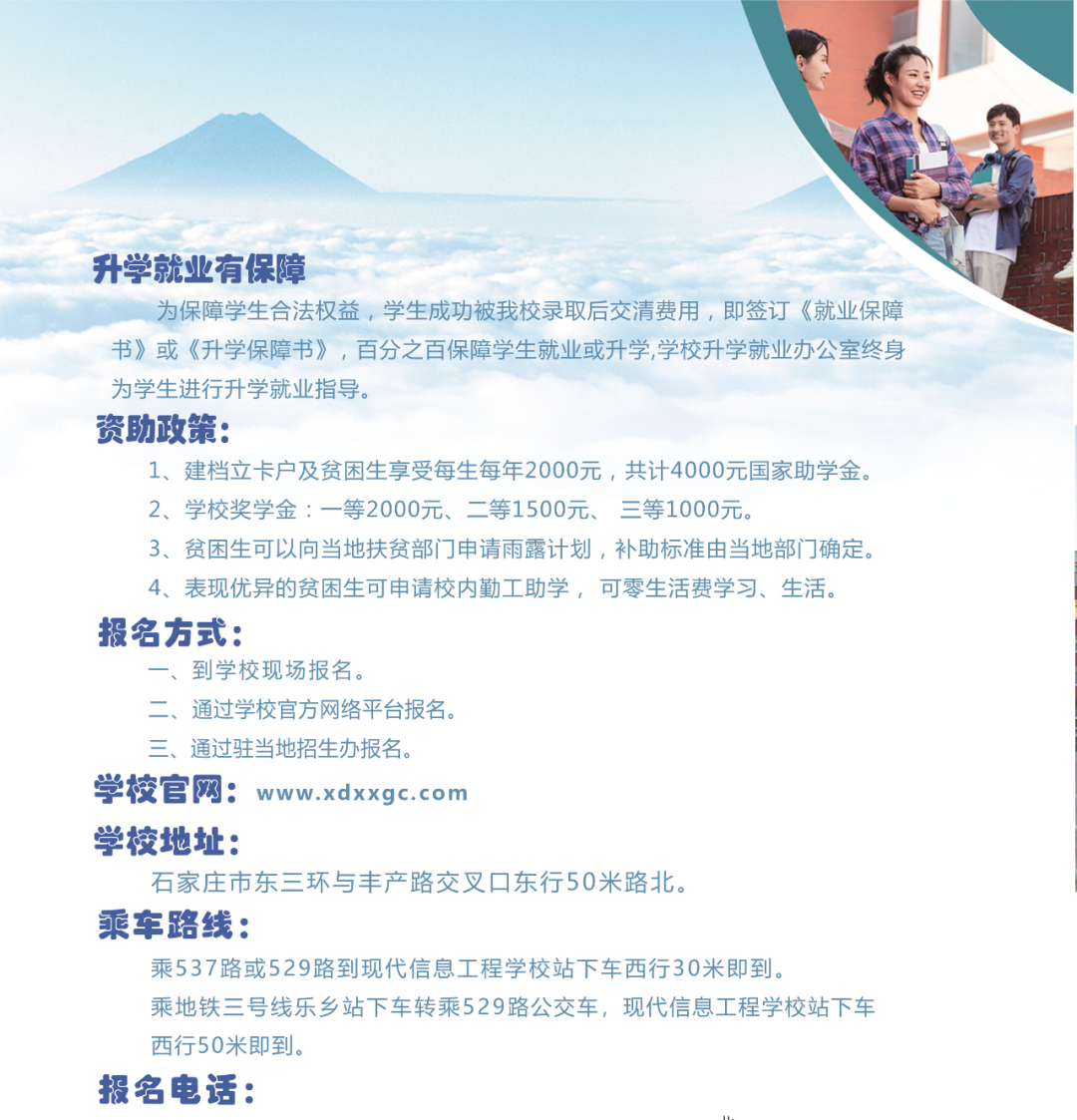 为保障学生合法权益,学生成功被我校录取后交清费用,即签订《就业保障书》及《定岗保障书》,百分之百保障学生就业及升学。学校升学就业办公室为学生升学就业指导。