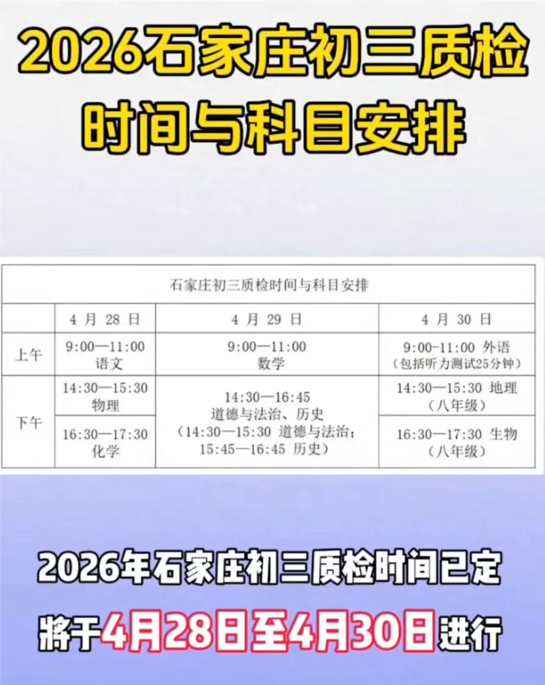 收藏 | 2026石家庄初三质检一模时间与科目安排确定!