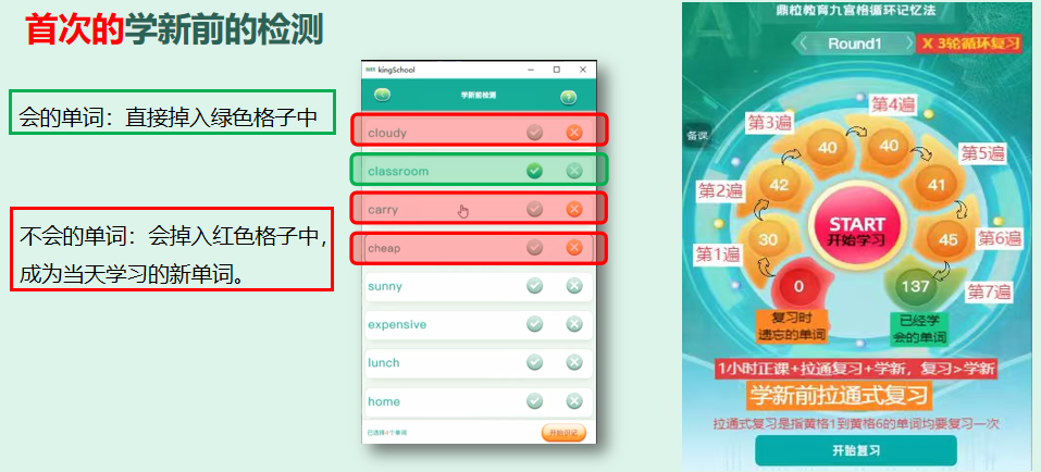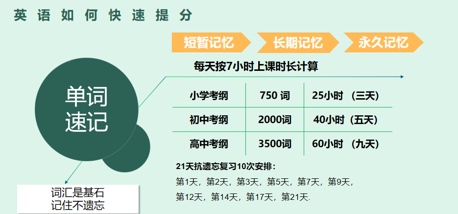我们采用九宫格循环记忆法与21天10次复习机制,帮助孩子高效掌握词汇:小学750词25小时,初中2000词40小时,高中3500词60小时,记忆牢固,不易遗忘。