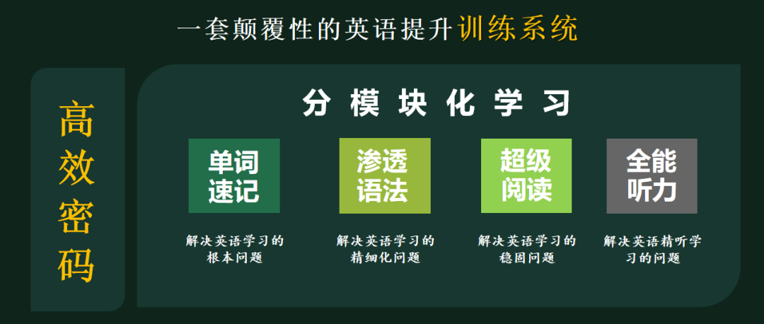 词汇量上来后,再学阅读和语法,英语能力会像火箭般提升!单词储备扩充,必然反向促进阅读能力,实现高效阅读,在英语学习中持续领跑。这就是第二个底层逻辑:分模块训练是语言提升最高效的途径。