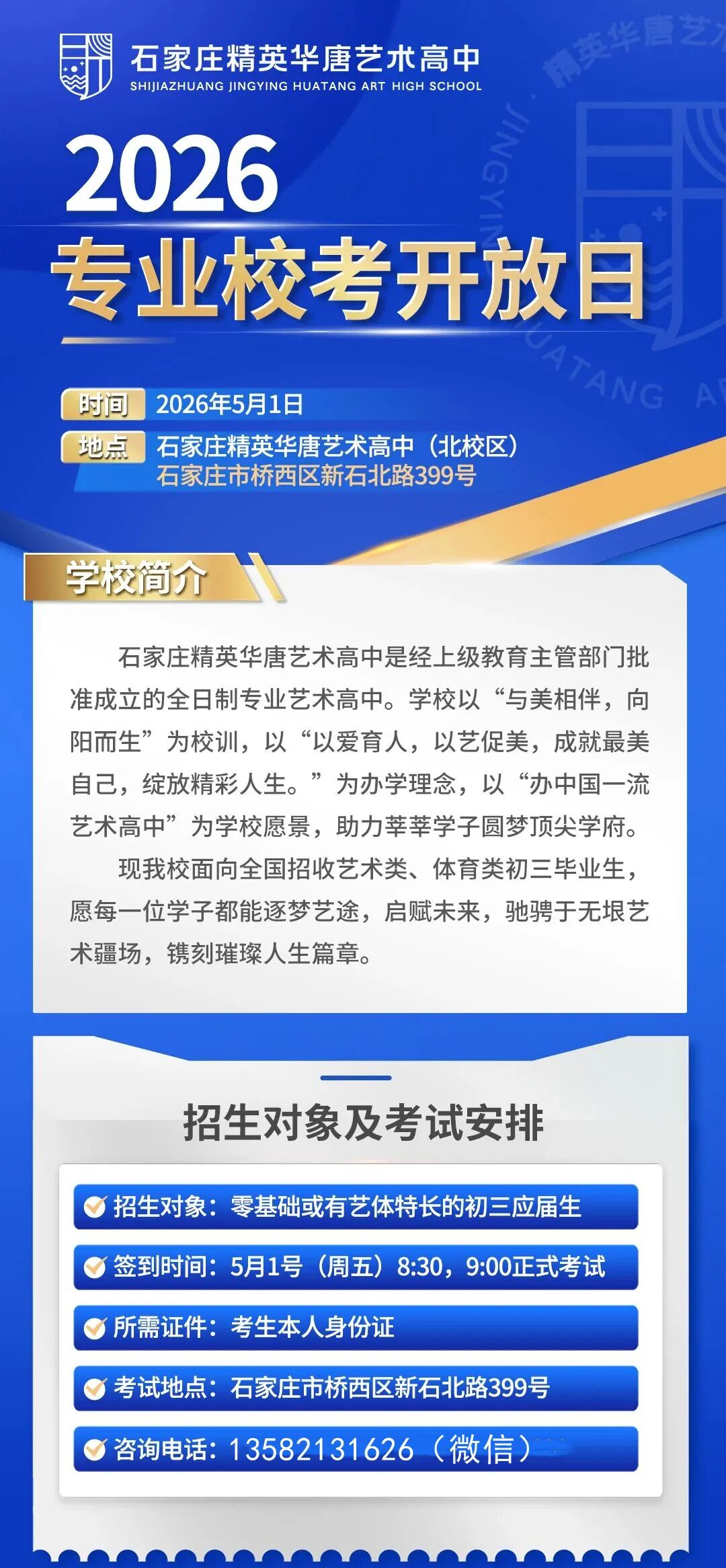 石家庄精英华唐艺术高中预约参观:13582131626(微信)了解学校。