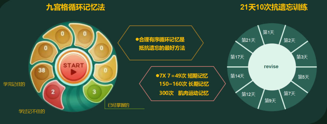 若复习时遗忘,退回红色格子,重新完成7次巩固,直至掌握。
