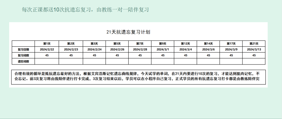 21天抗遗忘复习体系,按大脑记忆规律设计,陪练老师带领孩子循环复习近期内容。系统自动生成计划,精准推送复习任务。21天内完成10次复习,即可牢固掌握新知识。