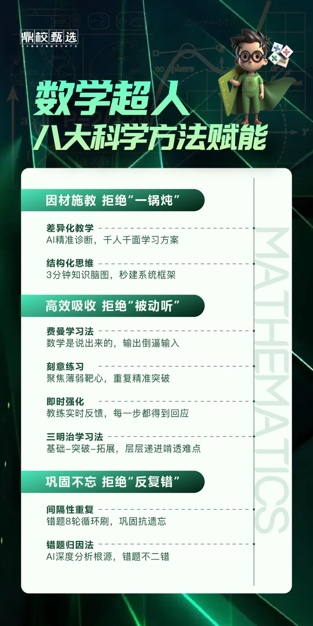 数学超人的八大方法,每个都瞄准初二学习的痛点,让知识吸收、巩固更高效: