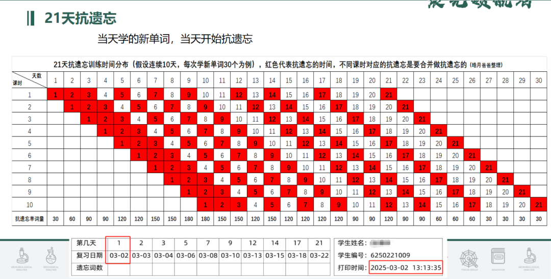 鼎英语训练在做九宫格循环的拉通式复习,以及课后的21天10次复习的(2-3-5-7)次复习,覆盖一周之内的抗遗忘?