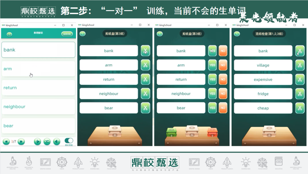 鼎英语训练记单词,在捆绑式复习,剪纸盒,混组检查等。