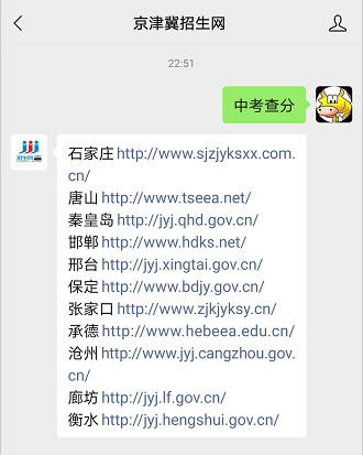 微信关注公众号【京津冀招生网】--菜单栏--回复“中考查分”