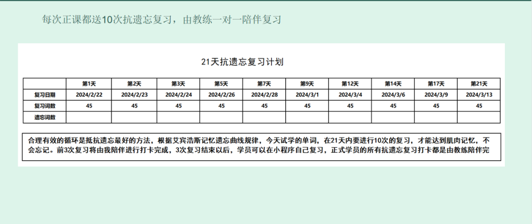 严格遵循大脑遗忘规律,学完后10 个关键时间点自动推送复习。每节 60 分钟正课,配套 21 天内 10 次抗遗忘训练,每次仅 5-10 分钟,72 小时单词遗忘率不到 5%,彻底告别 “反复背、反复忘” 的无效努力。