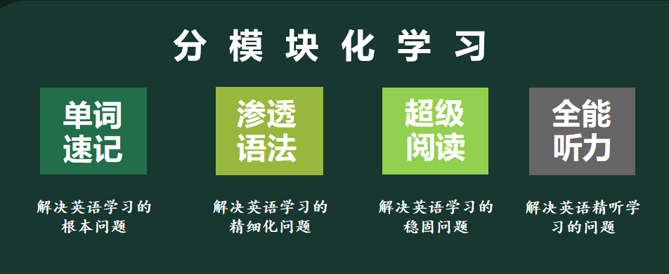 将英语拆分为单词、语法、阅读、写作、听力五大模块,逐个击破: