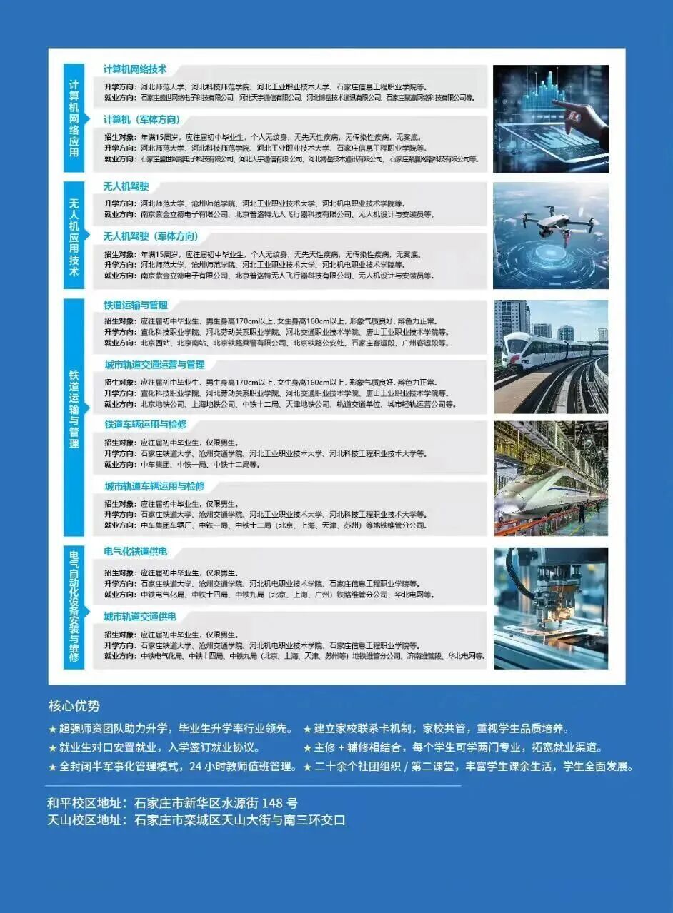 (2)升学方向:河北师范大学、河北科技师范学院、河北工业职业技术大学、石家庄信息工程职业学院等。