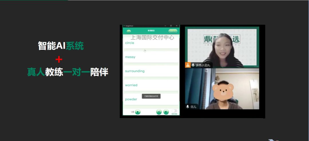 鼎校英语采用“AI智能系统+真人教练1对1”的模式,完美解决这个问题。AI系统负责智能诊断孩子的学习盲区、推送针对性题库、规划科学复习时间;真人教练则全程陪伴,不搞传统“授课”,而是引导孩子完成训练,实时互动、纠正发音、情绪激励,确保孩子上课全程专注,专注力从20分钟提升至1小时以上。