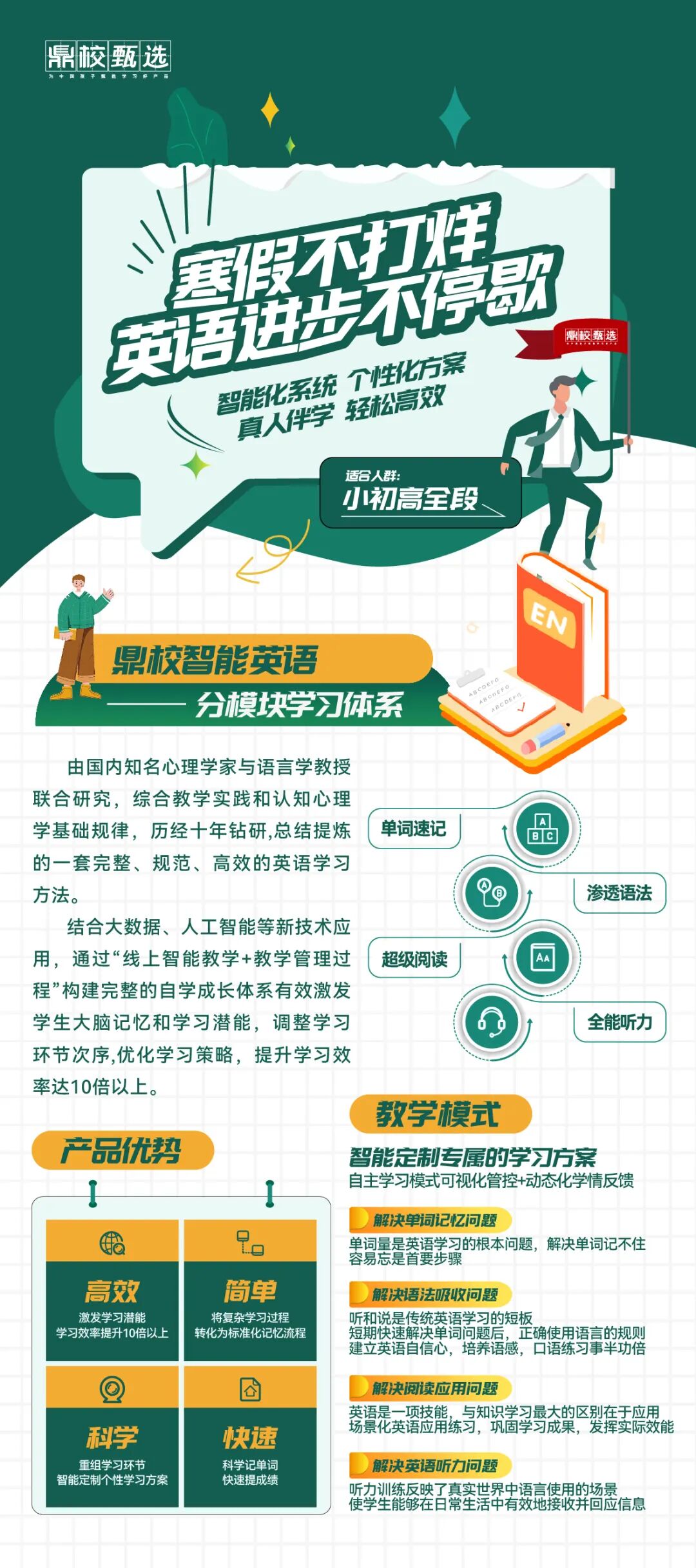 别让这个寒假闲置,让鼎校英语成为你英语飞跃的加速器!我们承诺,每一位学员都将获得个性化学习计划、教练伴学确保每位同学都能得到充分的关注与指导。更有机会参与线上英语角、国际文化交流活动,让你的英语学习之旅更加丰富多彩。