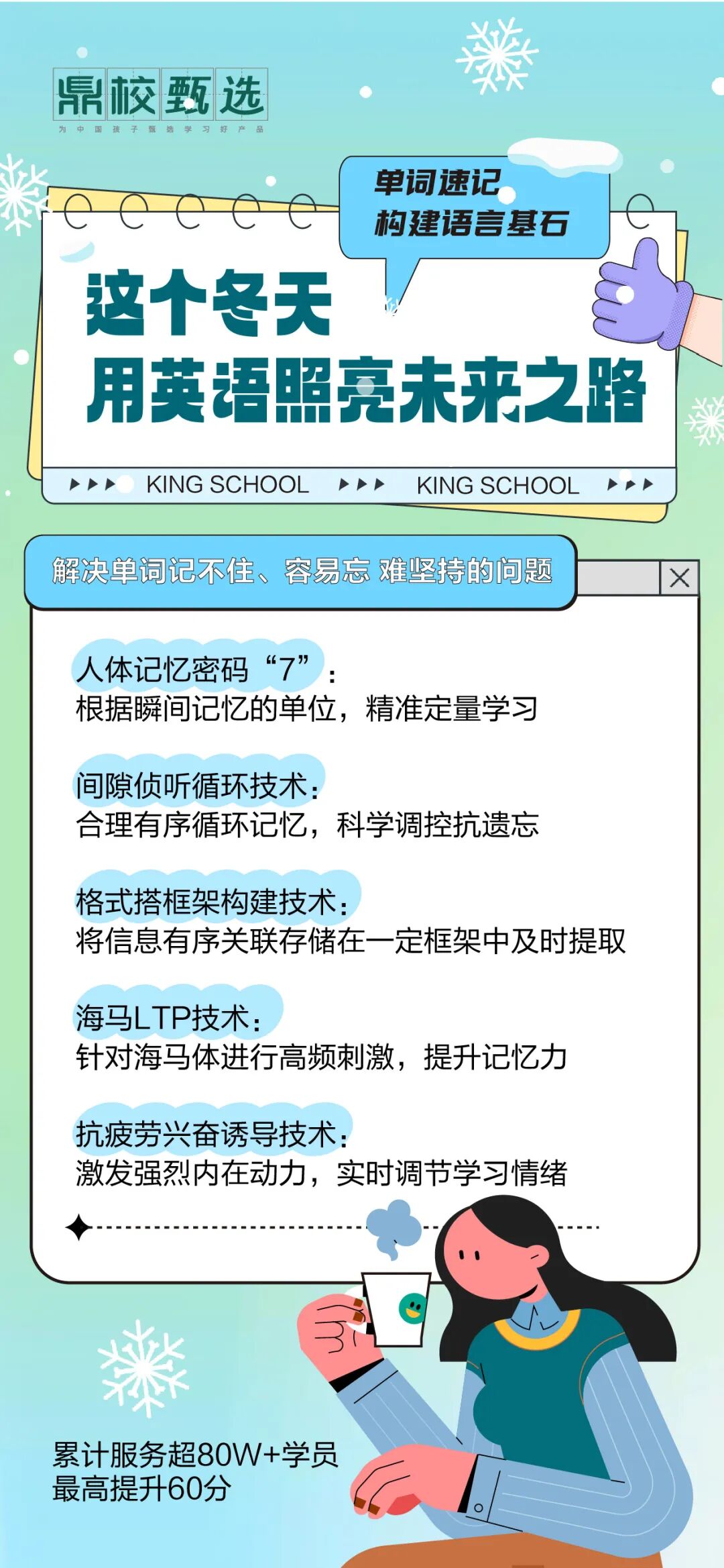 通过趣味记忆法、互动式游戏,让每一个单词都生动起来,不再只是纸上的字母组合,而是你能够自信运用的语言工具。加入我们,让这个寒假成为你词汇量飙升的起点!