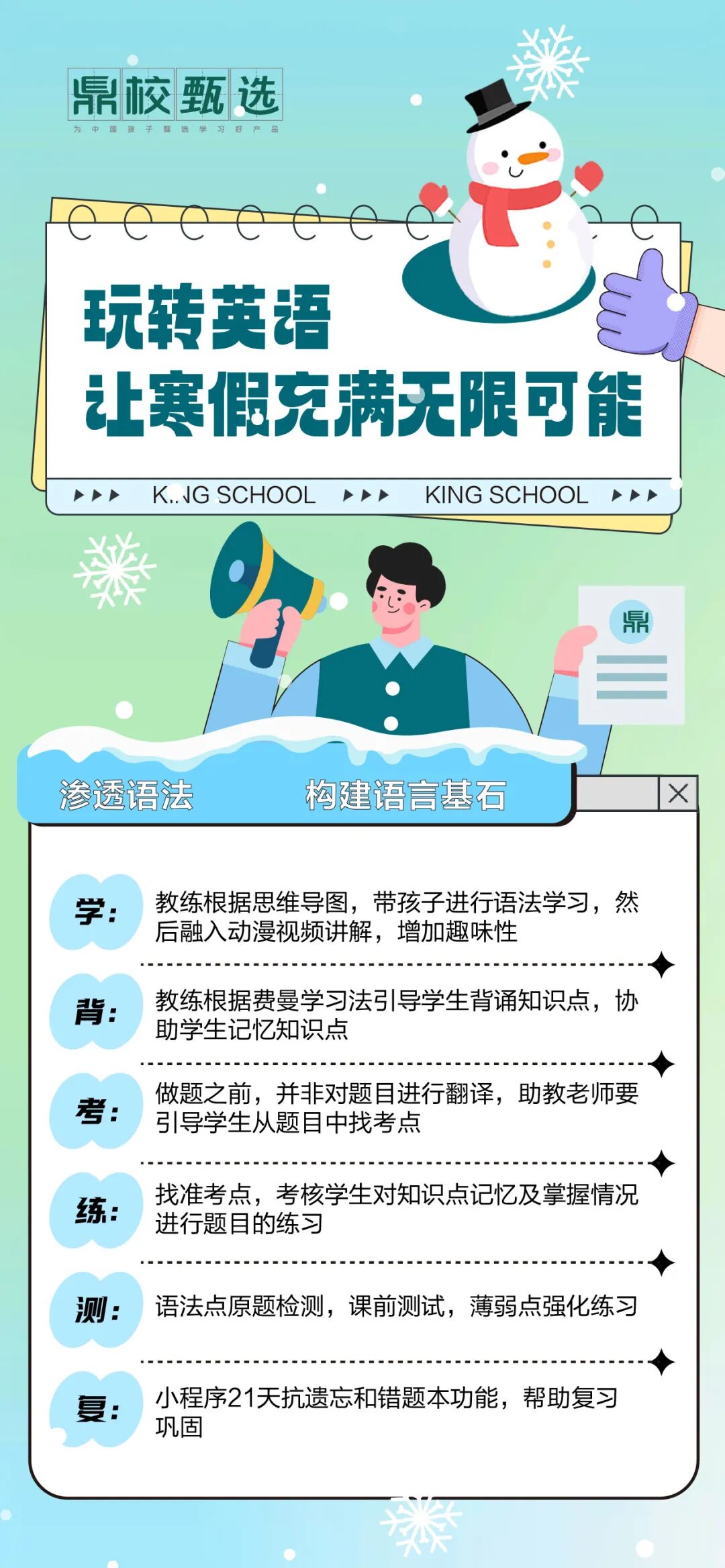 亲爱的同学们,寒假将至,是时候为你的英语学习之旅增添一抹亮色了!在鼎校英语,我们精心设计了单词速记课程,带你穿梭于词汇的海洋,发现那些藏在日常对话与经典阅读中的宝藏单词。