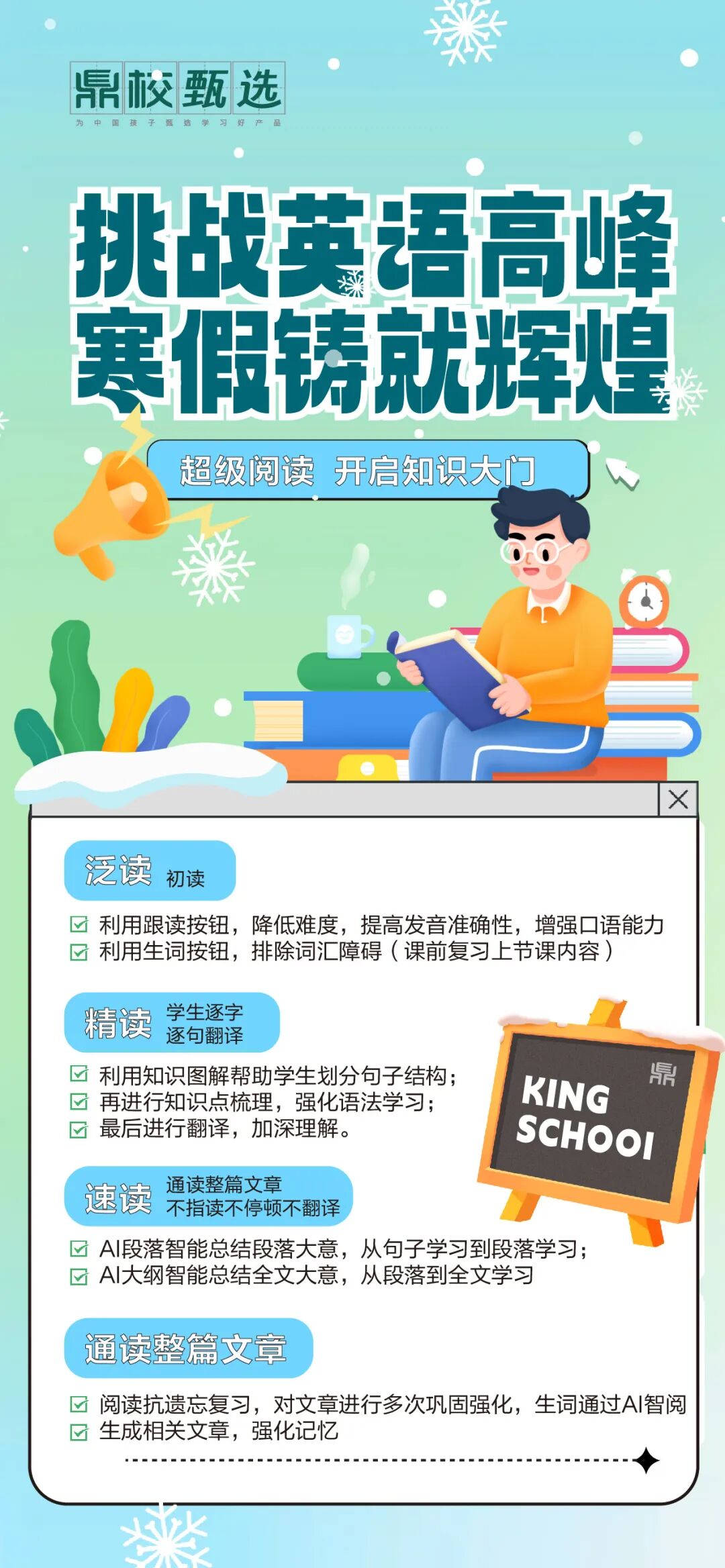 鼎校英语寒假特设“超级阅读”,精选推理判断题、细节理解题、主旨大意题等多类型阅读材料,结合文化背景讲解与深度讨论,不仅提升你的阅读理解能力,更能拓宽国际视野,感受不同文化的魅力。在这里,你将与全国小朋友一起成长,让每一次翻页都成为一次心灵的触动。
