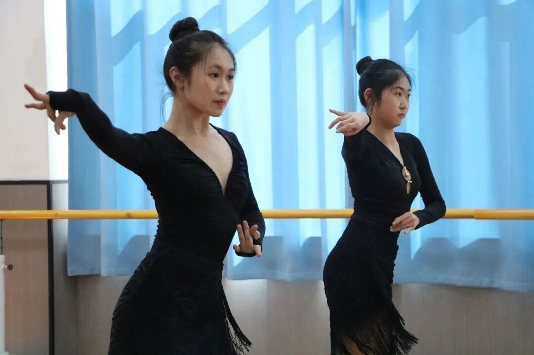 女生盘发,拉丁舞穿拉丁练功服和练功鞋,软开穿软底练功鞋。