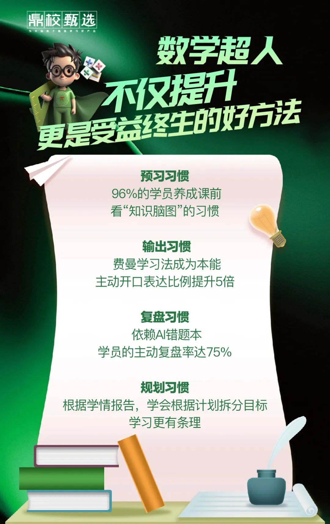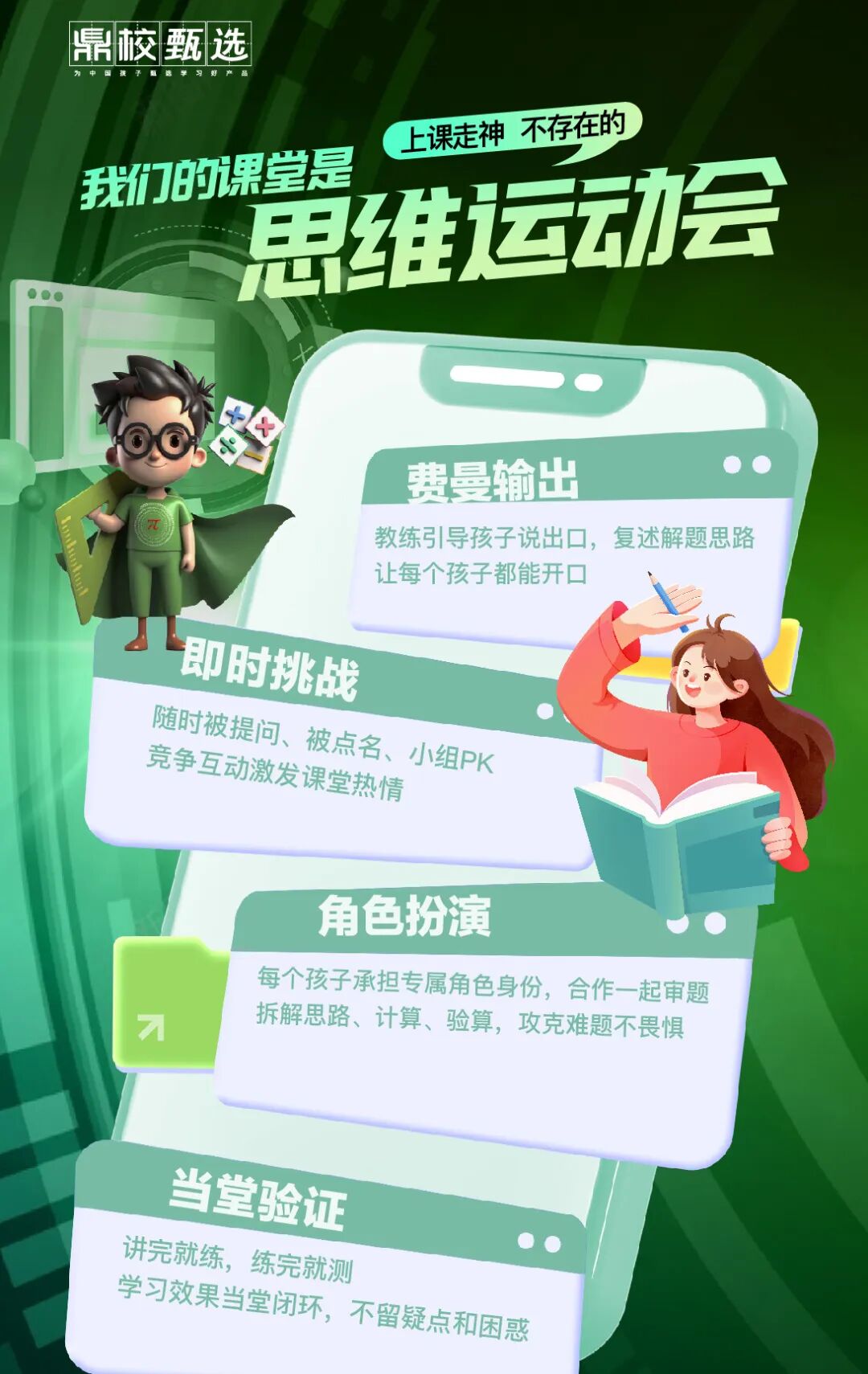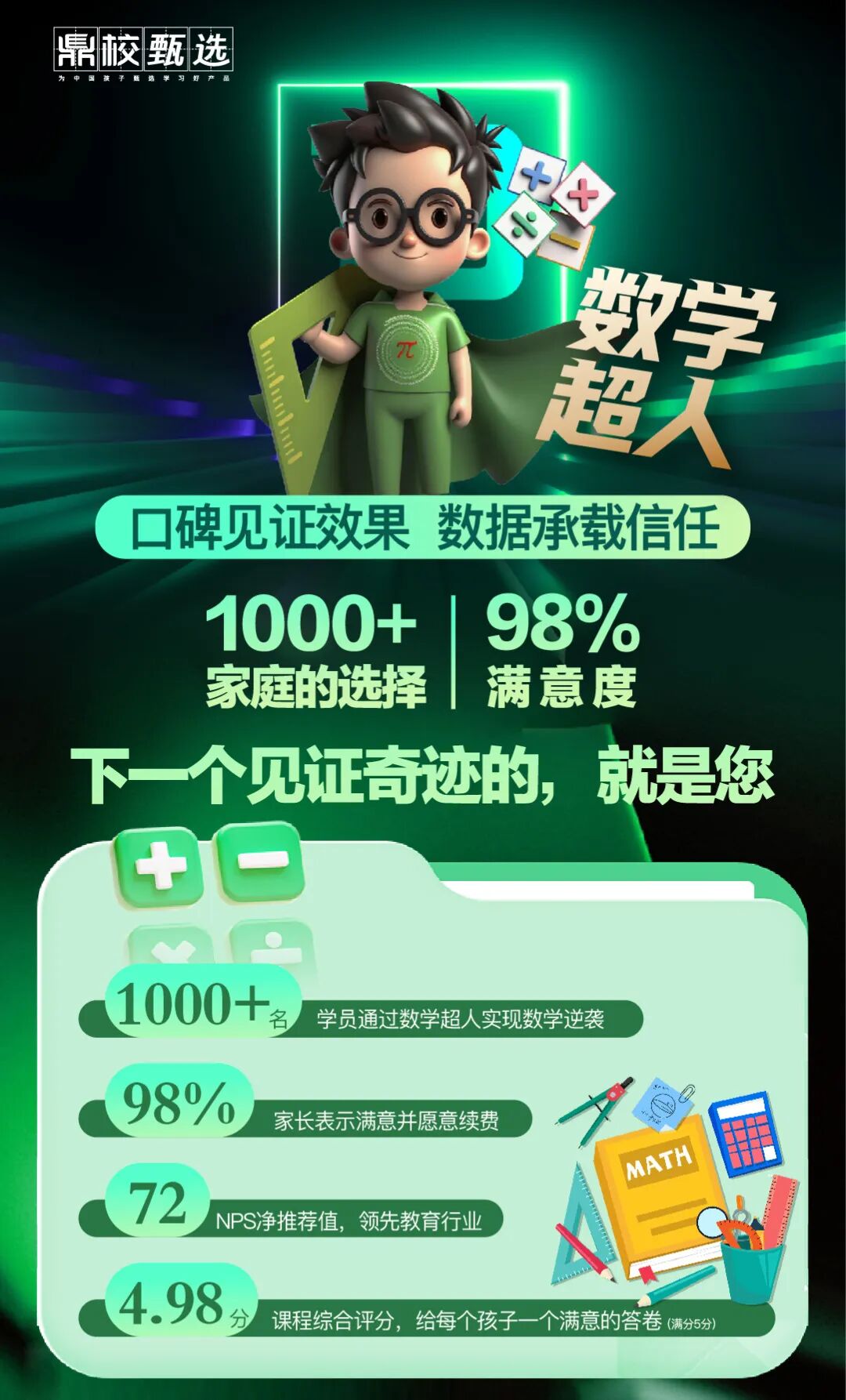 传统辅导班用模糊诊断、碎片授课、单向灌输消耗孩子,而鼎校【数学超人】让孩子告别低效努力,真正激活数学超能力。