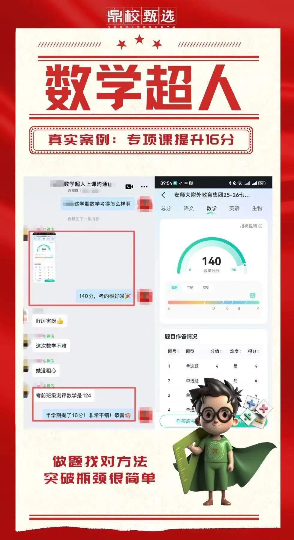 家长看着孩子考前熬夜刷题、埋头苦学,成绩却始终没有起色,心里又焦虑又无奈;孩子也因付出没有回报,越学越自卑,上课走神、作业敷衍,面对一元二次方程的题目甚至直接空题放弃。