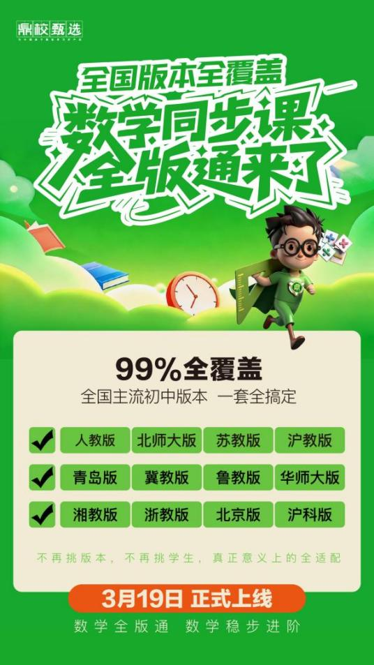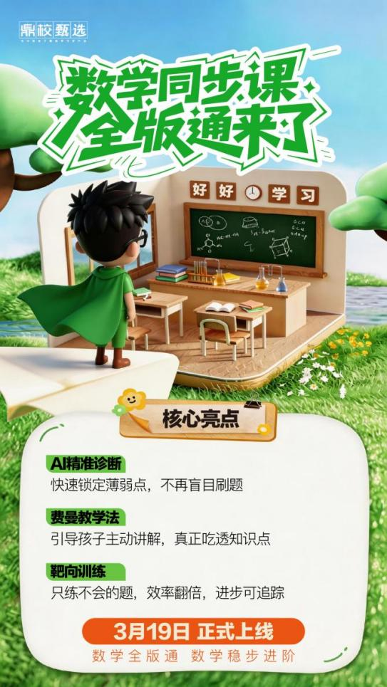 这份硬核实力,将以更全面的形态陪伴更多孩子——鼎校超人同步课全版通3月19日正式上线,解锁高效提分新路径。