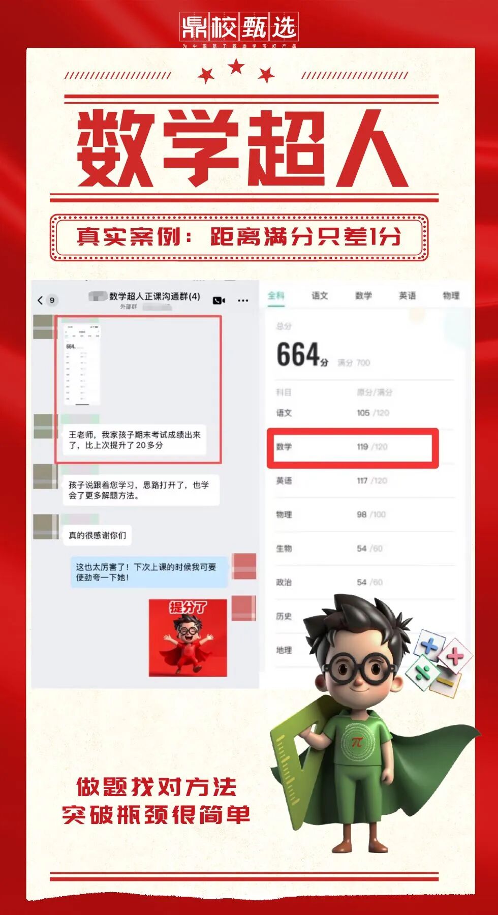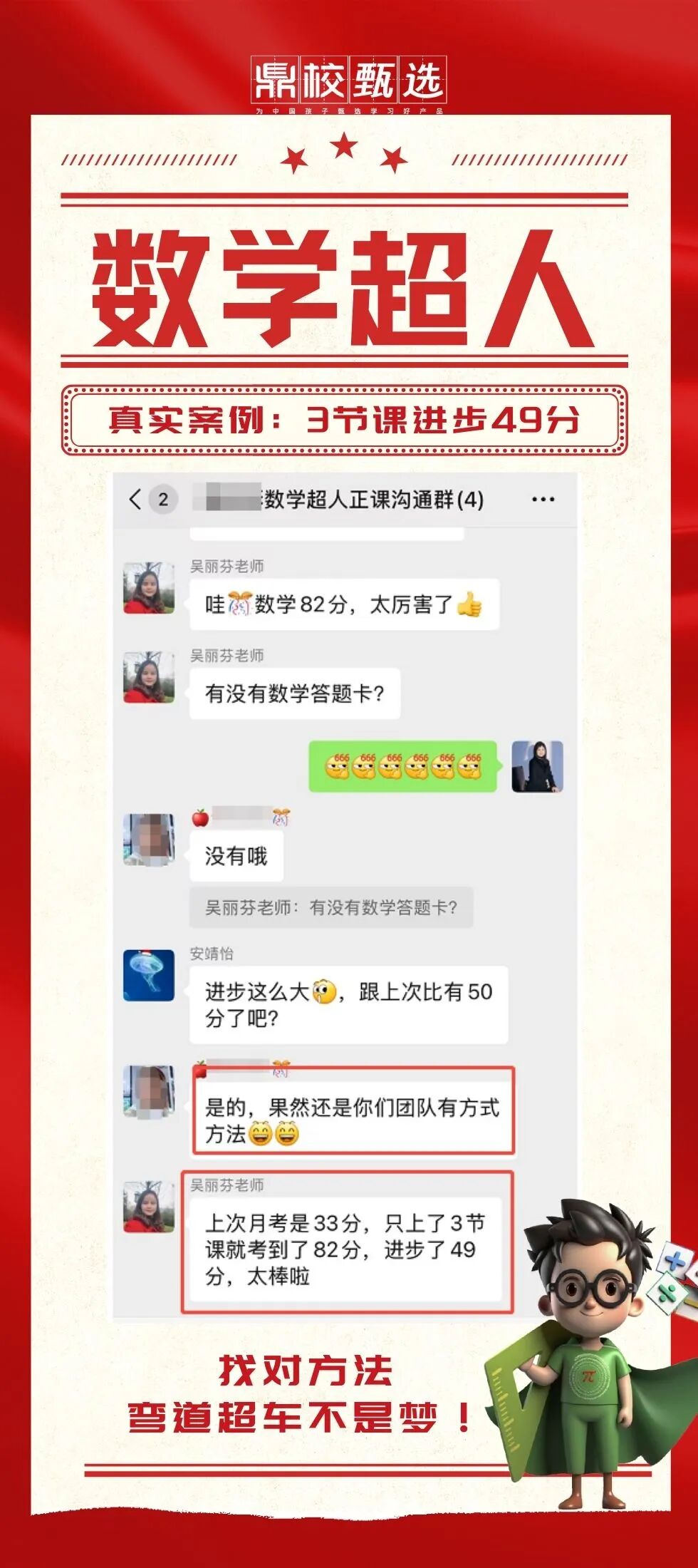 家长欣慰地表示:“这次孩子整体进步了20名,数学超人妥妥的帮了他一把,后期学习的状态也特别好,感觉也是找到了方法,付出得到了收获。”如今孩子不再因数学自卑,课堂上愿意主动回答问题,课后也会主动钻研数学难题,学习劲头越来越足。