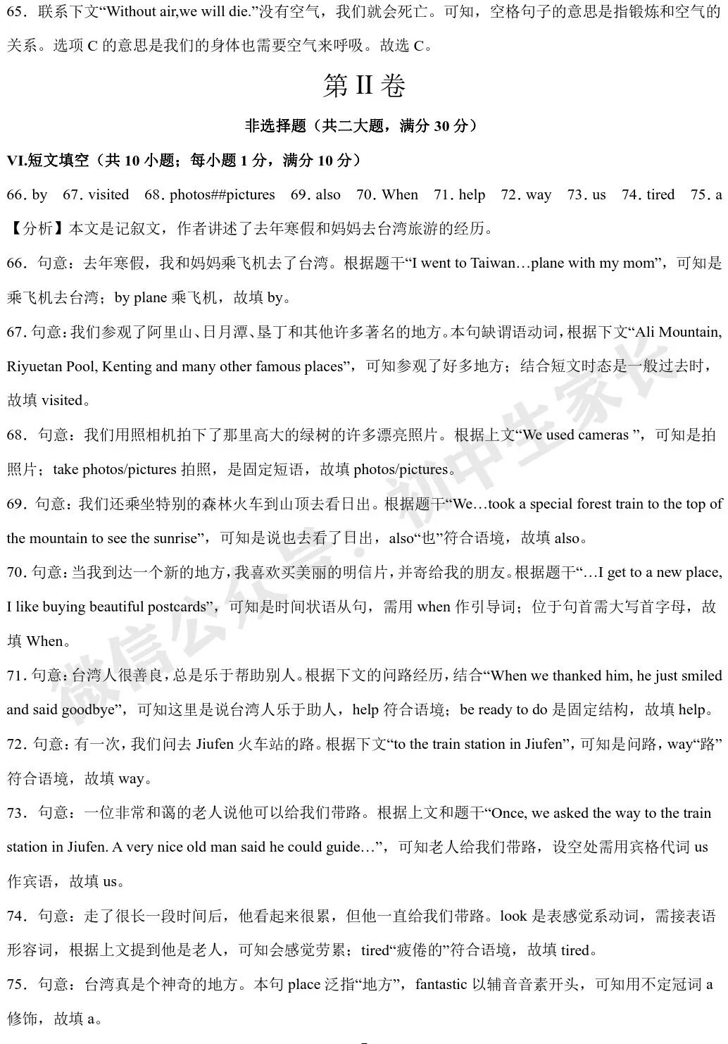 Taiwan is a very beautiful place. Last winter holiday, I went to Taiwan __66__ plane with my mom. We __67__ Ali Mountain, Riyuetan Pool, Kenting and many other famous places. We sang and danced happily with many people in Ali Mountain. We used cameras to take many nice __68__ of the tall and green trees there. We __69__ took a special forest train to the top of the mountain to see the sunrise (日出). It was so wonderful that we jumped up and down.