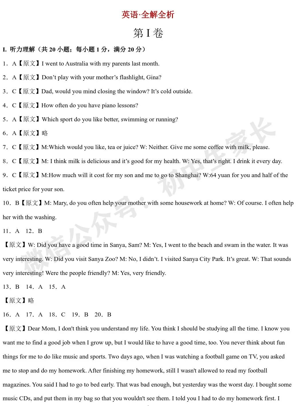 I. 听力理解(共20小题;每小题1分,满分20分)