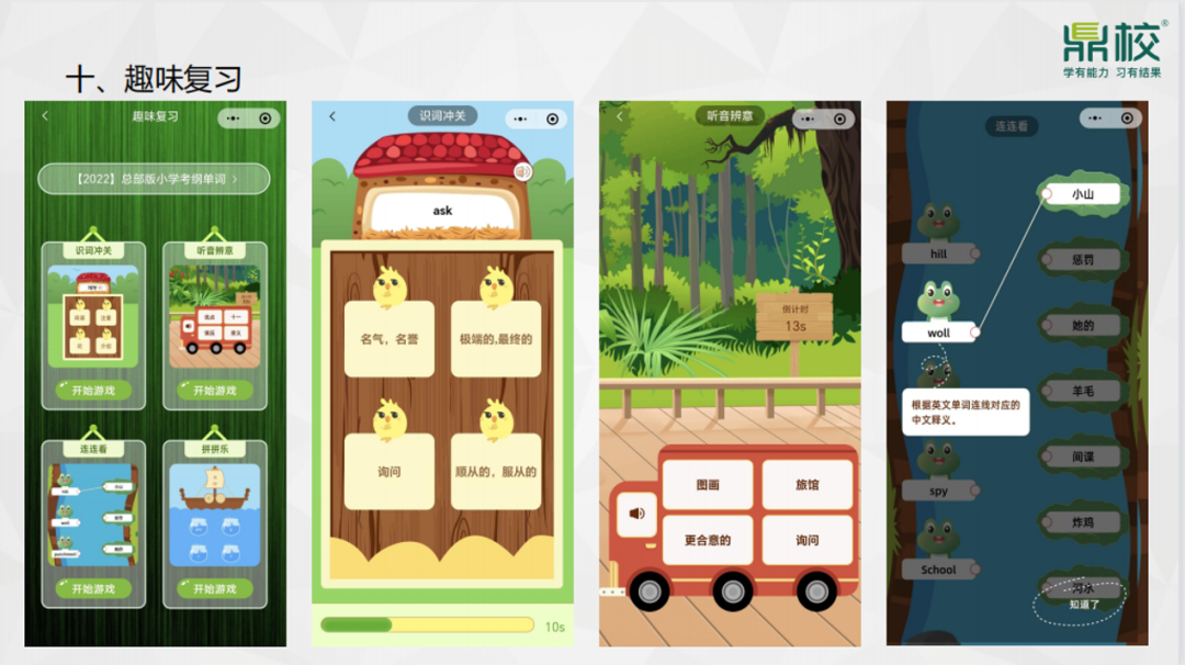 游戏式趣味训练:通过听音辩意、拼拼乐、单词冲关、连连看等游戏式的训练形式,让孩子学得轻松、有趣,避免枯燥。