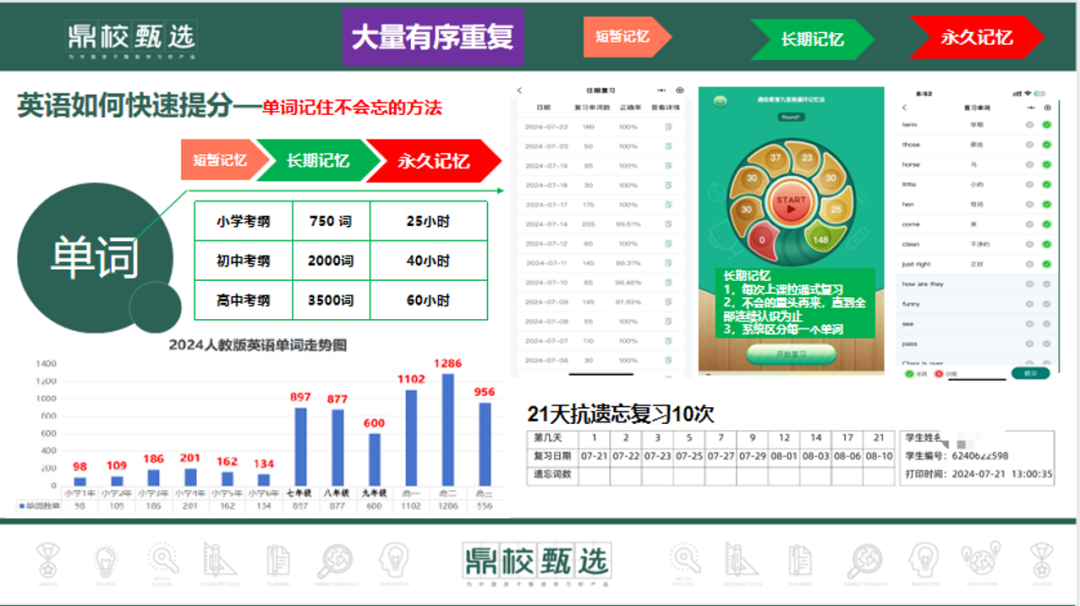 大量开口读:训练模式是通过腾讯会议在线上“一对一”,1个教练带1个孩子,互动式训练孩子记忆单词。教练开口读一次,学子开口读一次,全程互动起来,训练1个小时,带孩子记住20-50个单词,教练带孩子大量开口读,练习的次数50遍以上,大量刺激大脑管理记忆的区域“海马体”,从而让孩子短期记得住。