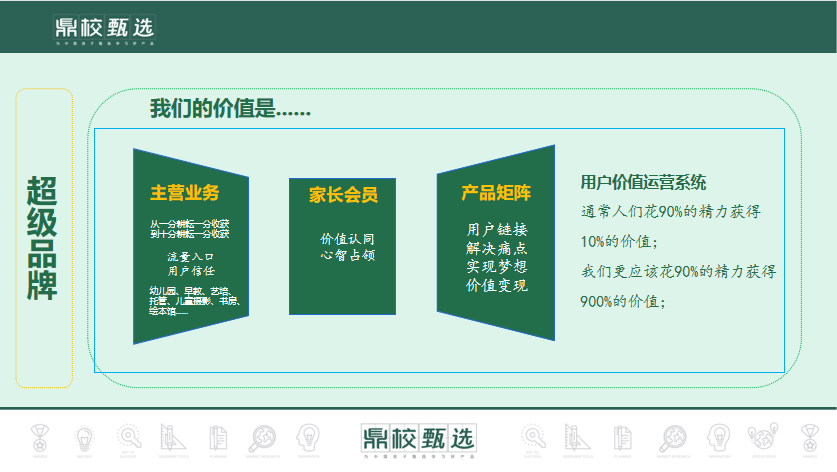 最后,鼎校英语强调了超级品牌的重要性,认为每个教育从业者都应该建立自己的甄选系统,通过用户价值运营系统获取持续的教育消费价值。鼎校英语提供产品精选、技术服务、运营支撑和落地赋能,帮助合作伙伴实现品牌的长远发展。