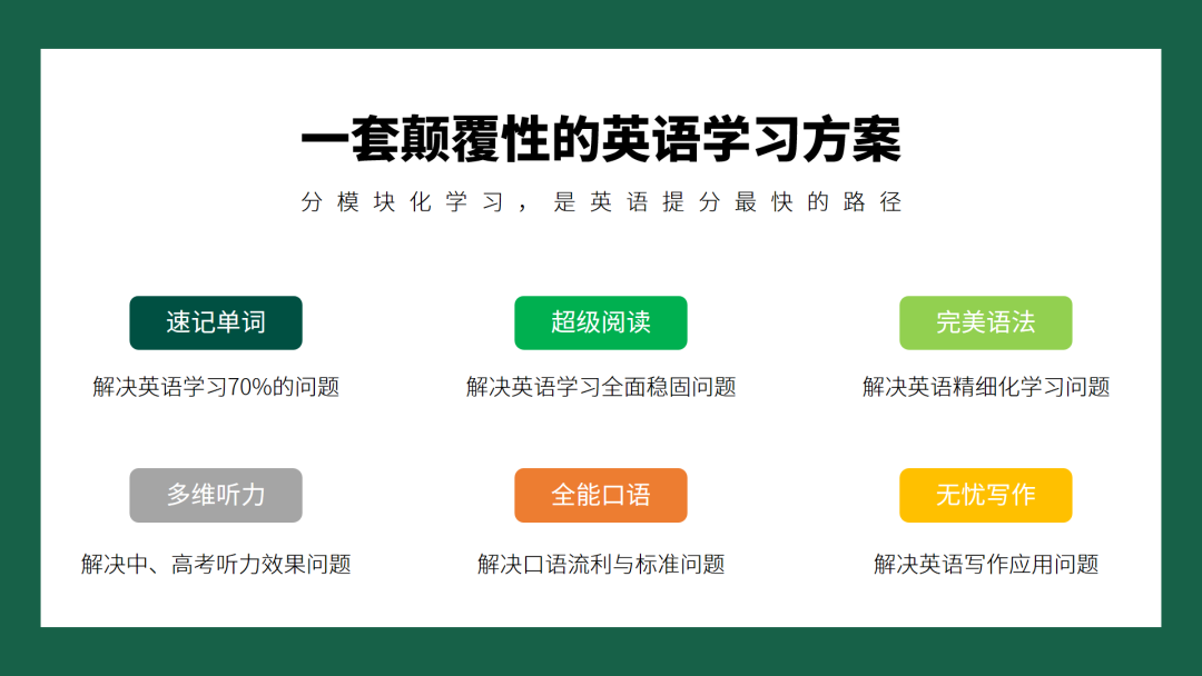 总体来讲,通过分模块学习,高效快速的提升学生英语能力(和成绩)。尤其对于小高、初高中学生,是最快捷高效的方式。