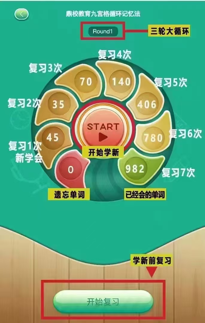 九宫格循环记忆法,解决的学生最早的时候所学内容的复习。所以说,学生在上课过程中跟着教练不断听说的过程+21天抗遗忘复习的过程+九宫格的所有数据推送到绿色格子的过程,还有每个阶段学完后,教练带着学生做3次通拉通式复习。