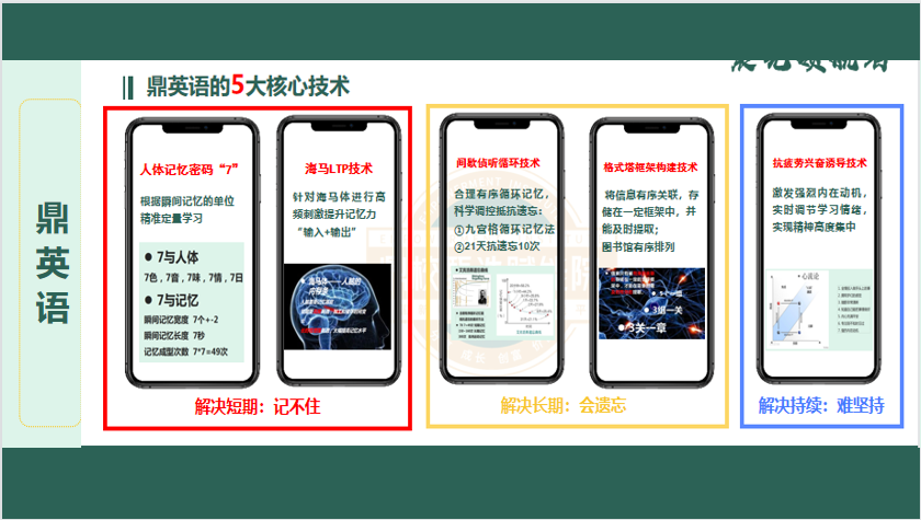 “鼎校”智能英语学习平台+教练VIP陪伴过程中,用到了脑科学相关的五大核心技术,帮助孩子学英语记得住,不遗忘,能坚持。