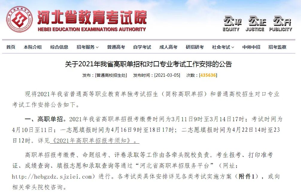 1.报名:3月11日9时至3月14日17时登录“河北省高职单招服务平台”(网址:http://hebgzdz.sjziei.com,以下简称“单招平台”)进行报考。报考时,根据考生不同专业需求选择考试二类(交通运输、能源动力与材料等所涉及专业)或考试十类(电子信息等所涉及专业),一旦选定不可更改。