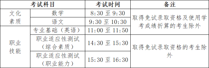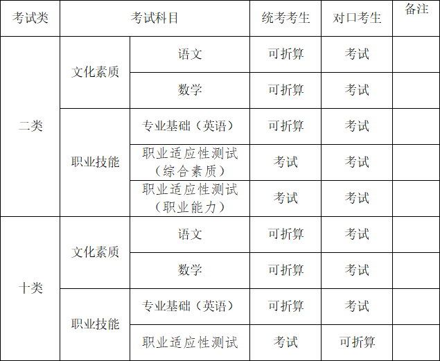 折算办法:文化素质成绩使用高中学业水平合格性考试(以下简称学考)中语文、数学科目的成绩折算替代,对应的分值为:A—130分;B—110分;C—90分;D—70分;E—50分。专业基础(英语)成绩使用外语科目的学考成绩代替,对应的分值为:A—90分;B—75分;C—60分;D—45分;E—30分。