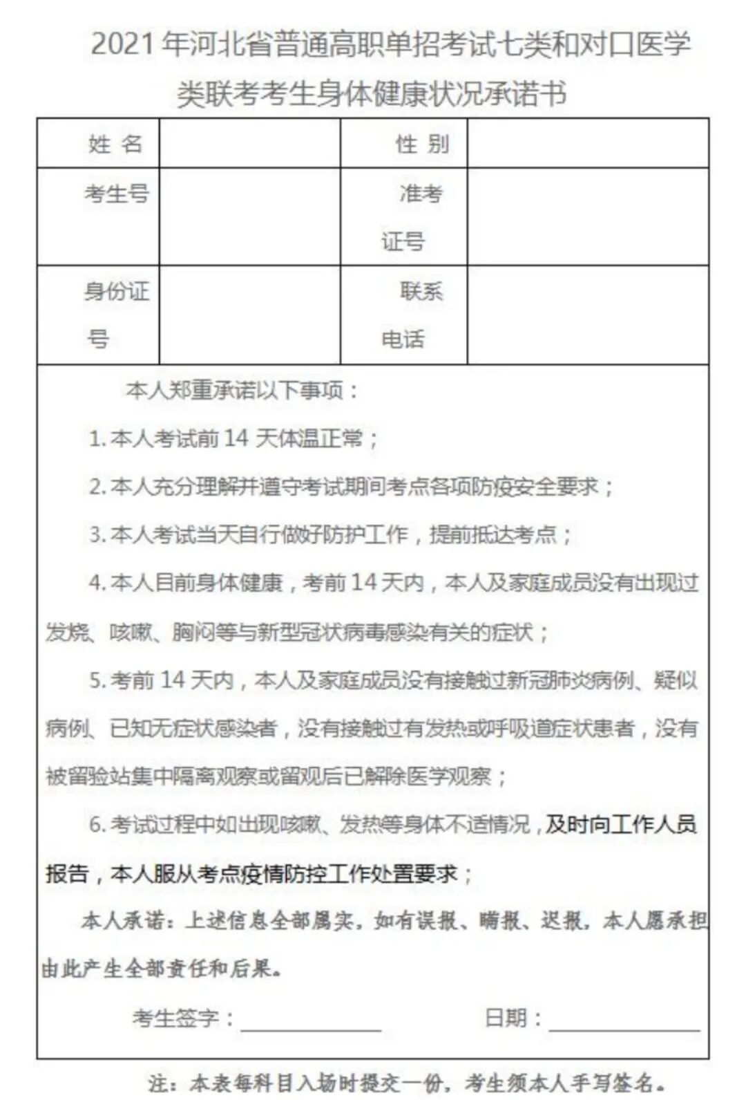本人考前7日内有效新冠病毒核酸检测阴性证明(原件或复印件)、本人考前72小时内“河北健康码”绿码(彩色打印版)、《2021年河北省普通高职单招考试七类和对口医学类联考考生身体健康状况承诺书》,以上材料要求考生在每场次考试时交给监考人员一份,请考生提前将相关身体健康证明材料准备充足。
