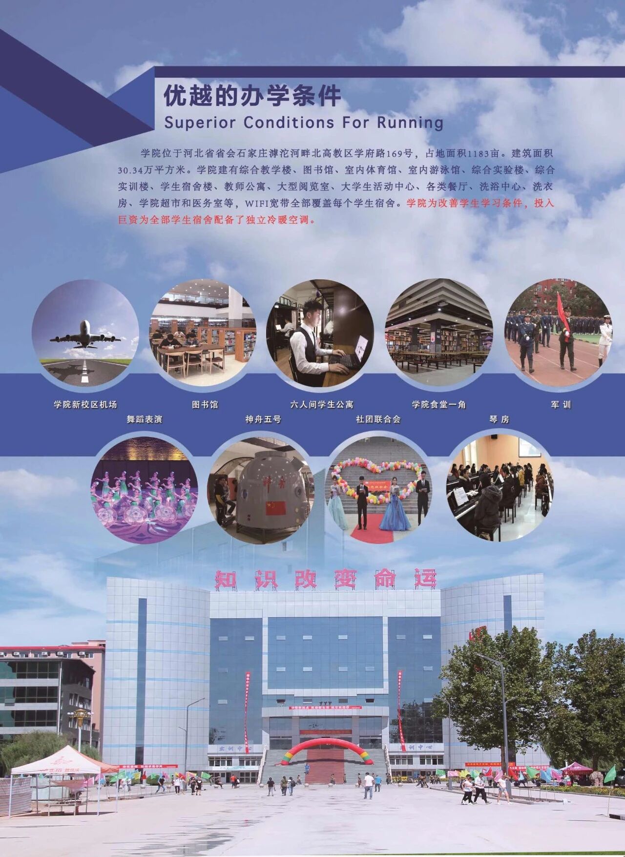 学院建有南北两个校区,(学府路校区和行唐校区),总占地面积1083亩,校舍面积18.87万平方米。现已建成教学楼、工程教育实践中心、科研楼、图书馆、行政楼、航空航天馆、大学生创业孵化实践基地、学生公寓及体育馆、游泳馆、篮球场、运动场等完备的标准化基础设施。