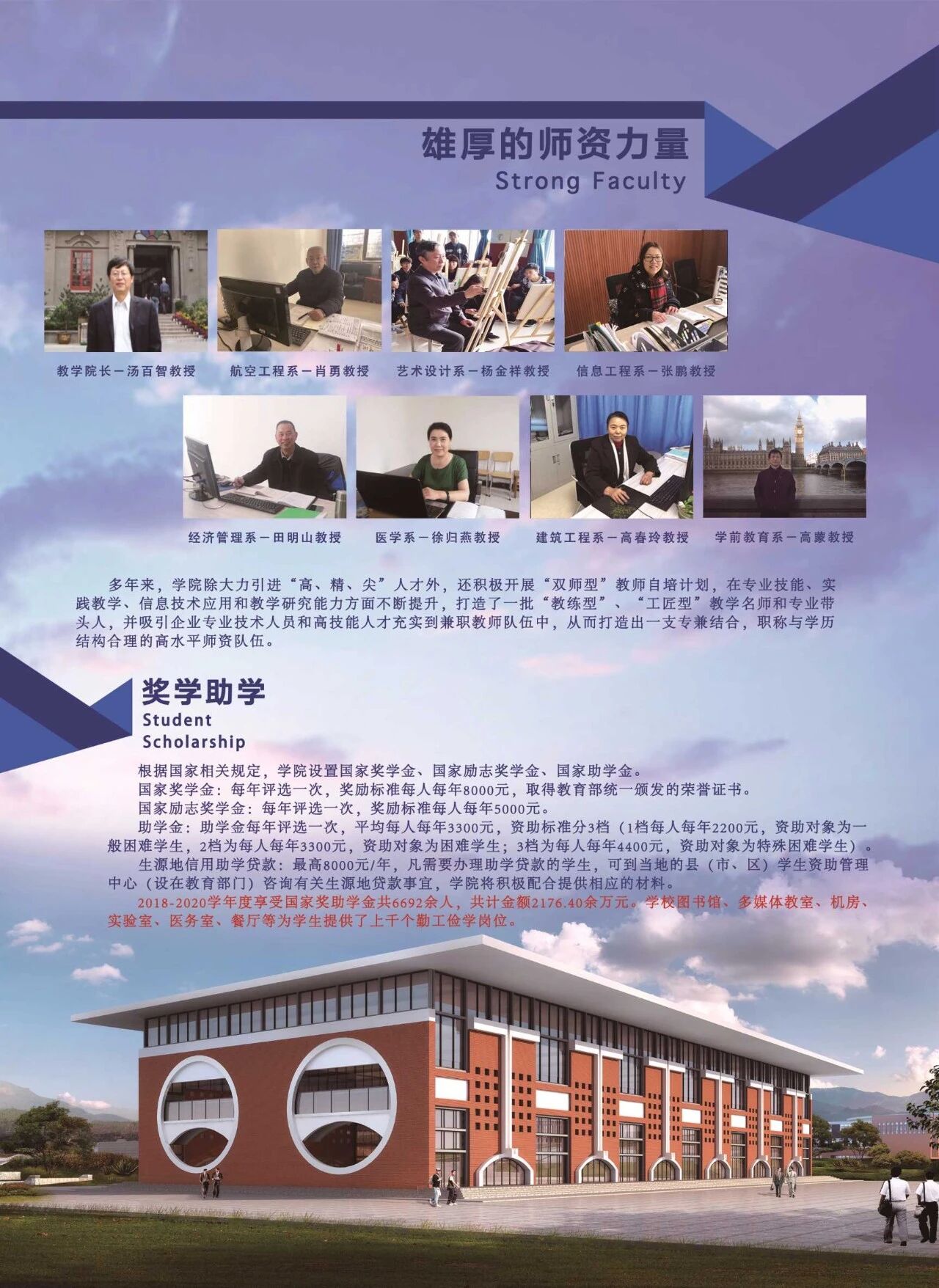 学院拥有一支专兼结合,职称与学历结构合理的高水平师资队伍,现有教职工500余人,全日制在校生10000余人。学院除大力引进“高、精、尖”人才外,还积极开展“双师型”教师自培计划,培养出一批“教练型”、“工匠型”教学名师和专业带头人,并吸引企业专业技术人员和高技能人才充实到兼职教师队伍中,从而打造出一支专兼结合,职称与学历结构合理的“双师型”师资队伍有一支专业水平高、业务素质强的师资队伍。