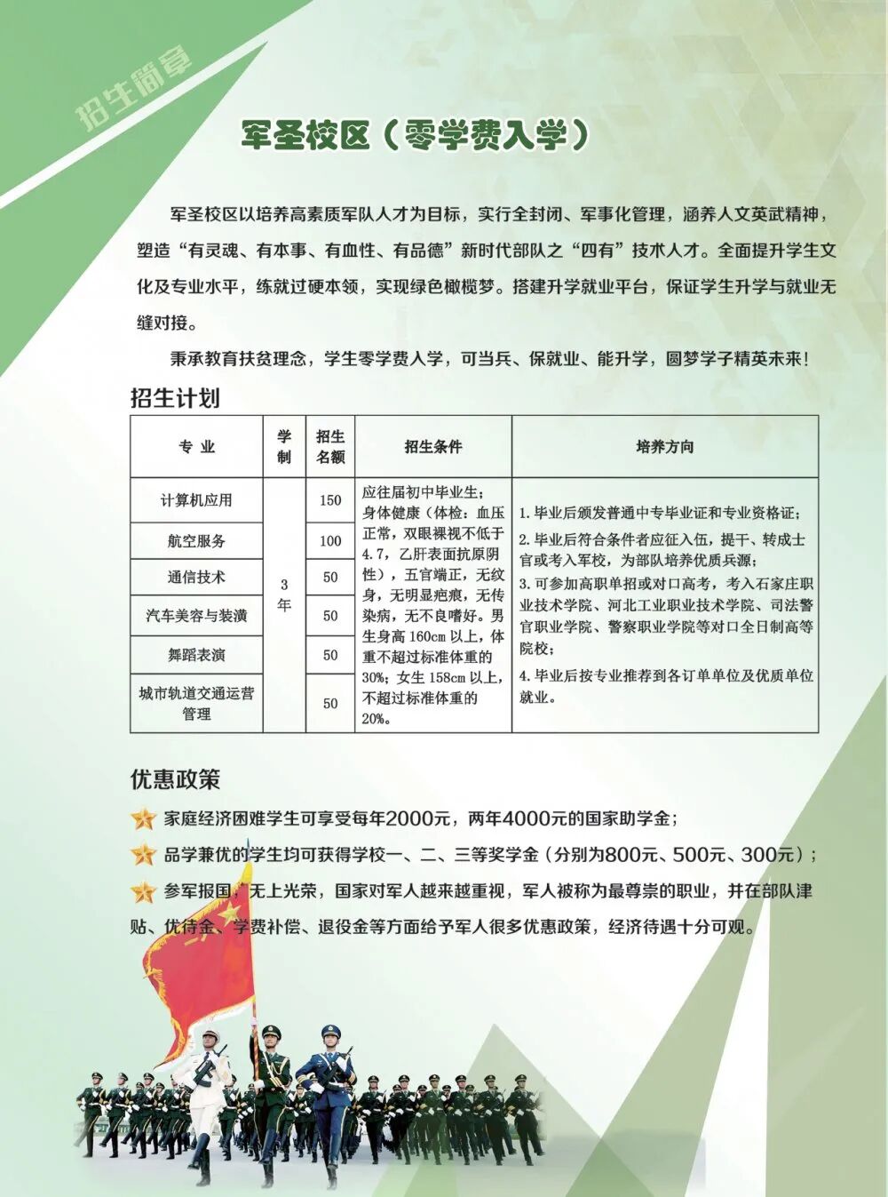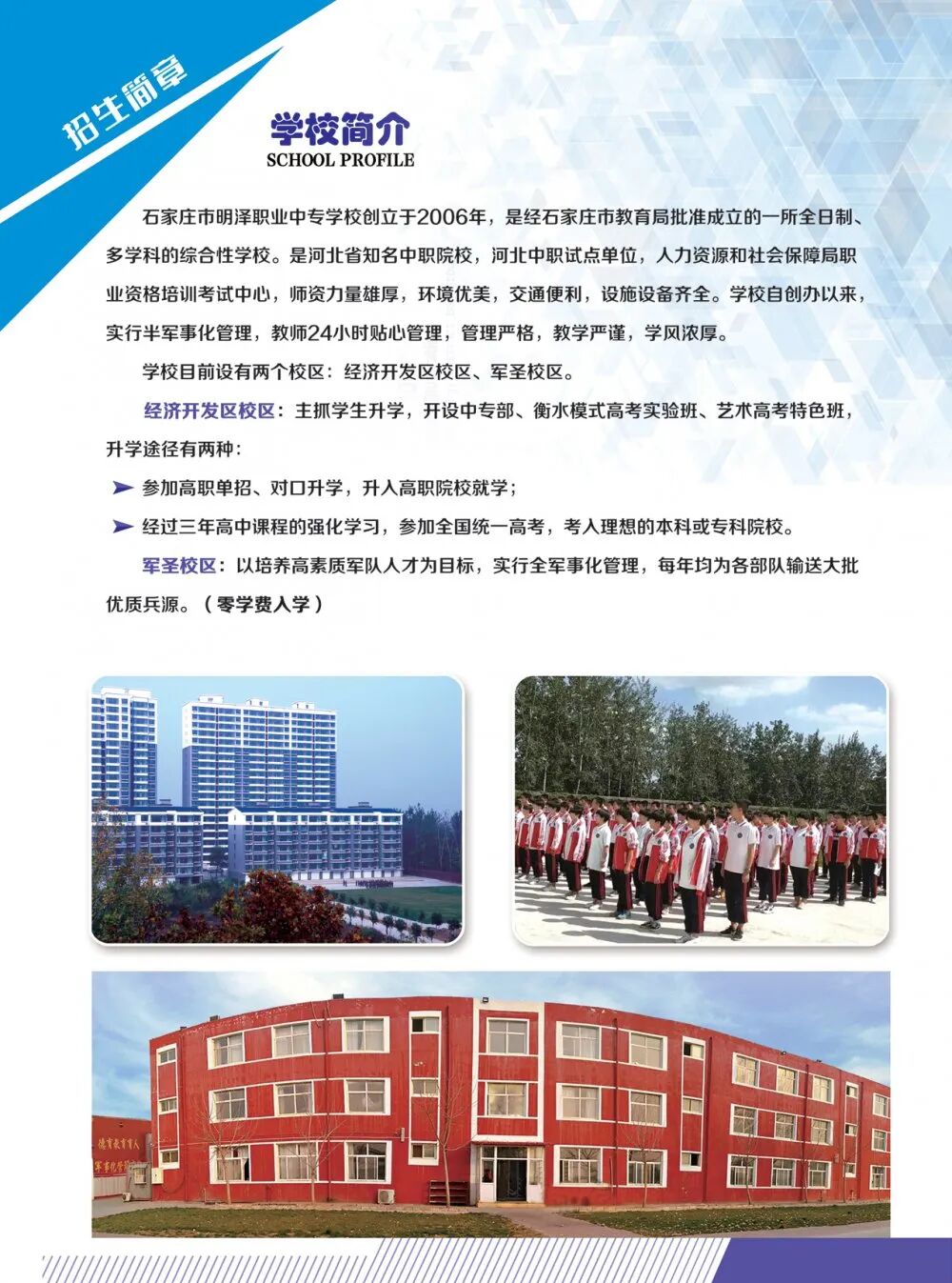 本校区是石家庄市民办教育协会常务理事单位、司法警官职业学院生源基地、优质兵源输出基地、教官培训中心。学校师资力量雄厚,设施设备齐全,环境优美,交通便利。学校自创办以来,管理严格,教学严谨,学风浓厚;学生升学率高,择业就业前景好;应征入伍人数多,每年均为部队输送大批优质兵源!