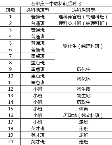 石家庄一中提供的是3+1+2模式(数语外+物理/历史二选一+生物/化学/地理/政治四选二)下的全部12种选科组合,共20个班。