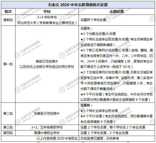 根据2020年中招文件,石家庄中考志愿填报分为5个批次,具体如下: